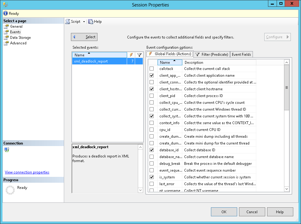 We should only need xml_deadlock_report event and we can either double-click on it or click on the “>“ sign. Once done, this event will appear in the “Selected events” list. Actually, an item of this list can be customized by double-clicking on it. So, if we double-click on xml_deadlock_report or if we select an item and click on the “Configure” button on top-right corner, the interface will change to an event editing panel as follows: