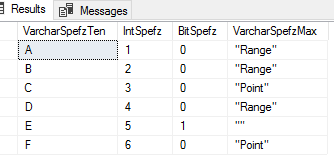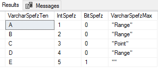 CREATE TABLE etlImport5( VarcharSpefzTen VARCHAR(10), IntSpefz INT, BitSpefz BIT, VarcharSpefzMax VARCHAR(MAX) ) |
