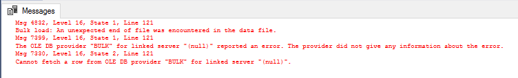 We see the three error row numbers that were experienced during the bulk insert with details.