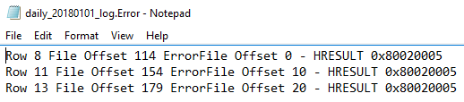 Because we’ve allowed up to 100 errors and we only experienced 3 errors, bulk insert continued to insert data and we see the 9 rows of good data, even with the error message about the 3 bad records. We also specified an error file and when we look at our file location, we see two additionally created files – daily_20180101_log and daily_20180101_log.Error. The below images show these files in the directory and their contents (I opened these files in Notepad).