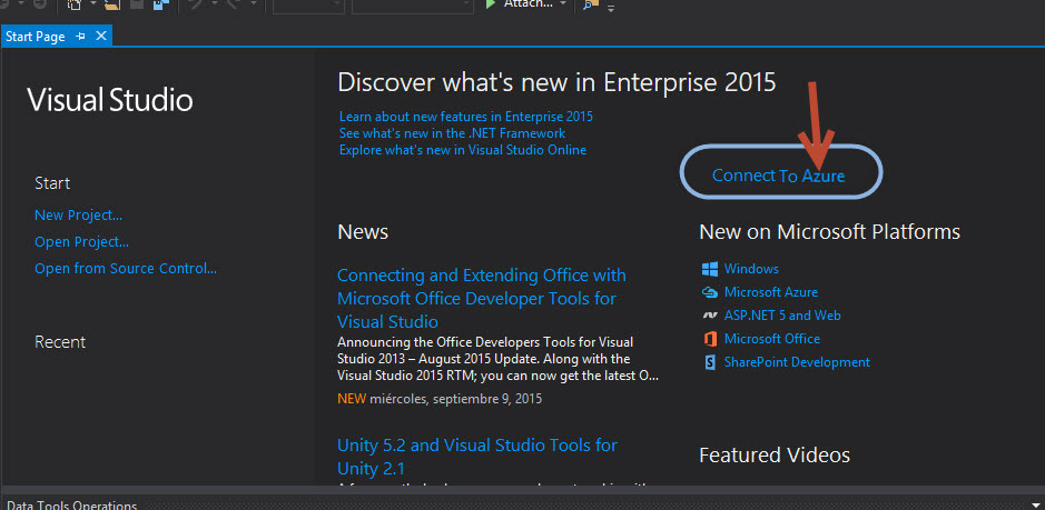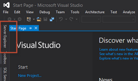 Figure 12. Connection to Visual Studio Click on the Server Explorer to verify the existing Azure objects