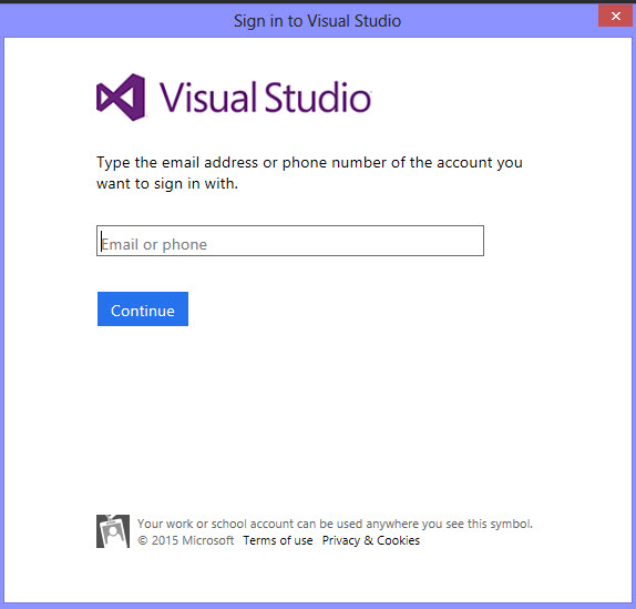 Figure 11. Visual Studio Specify the email address associated with your Azure Subscription and press continue.