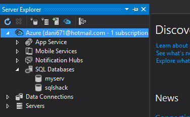 Figure 13. The Server Explorer You will be able to see the Azure icon associated with the subscription. Expand it and expand the SQL Databases.