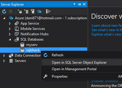 Figure 14. Connection to Azure Right click on the databases created in steps 1 to 10, and select Open in SQL Server Object Explorer. With this option, you will be able to see the database objects in Azure.
