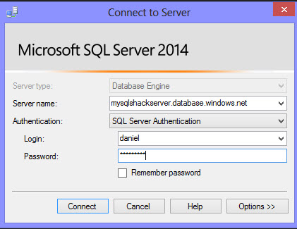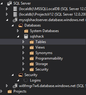 Figure 17. Database credentials You are now connected to Azure. Expand the database and you will be able to see the Tables, Views, synonyms and the Programmability section to create stored procedures, functions.