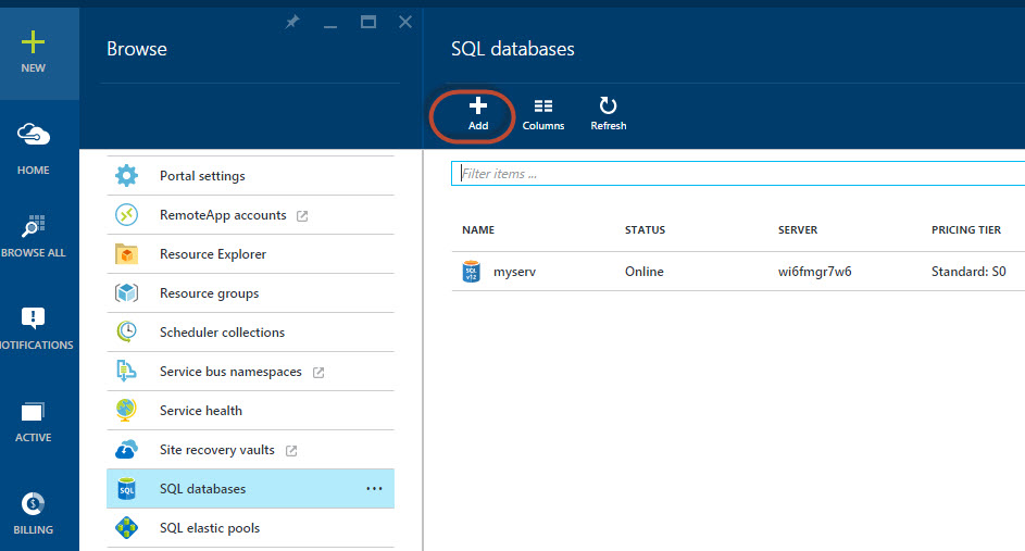 Figure 1. The Azure Portal Go to SQL databases and press the Add icon to add a new SQL database.