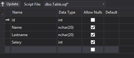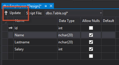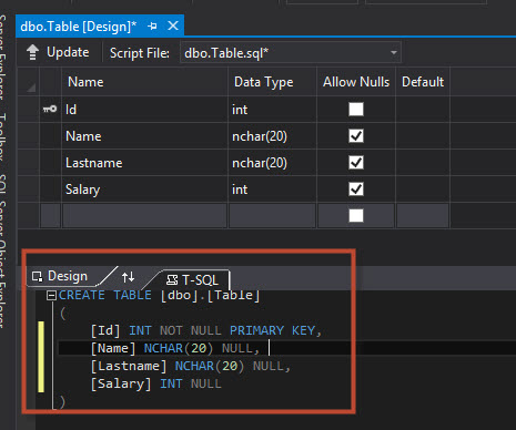 Figure 20. The Table Columns and data types As you can see, you can design the table and see the T-SQL script also. This is very useful if you want to edit the T-SQL directly or if you want to learn T-SQL. Change the table name of the table to employees.
