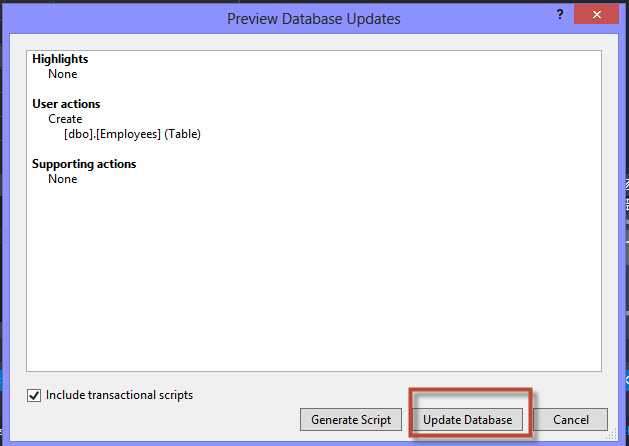 Figure 21. The T-SQL code Press Update to update the table in Azure. The script will be executed in the Azure database to create the new table named dbo.employees.