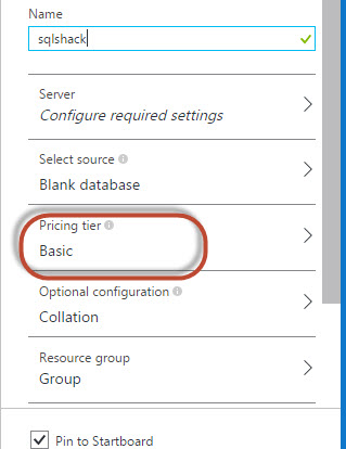 Figure 3. The sql database options If you like your money use a database cheaper. Specially if you are testing like me. The more GB, the more expensive it is. I will use the Basic Pricing. Verify your company needs and the space required for your company in order to chose the best option. The basic are usually the cheapest options, the standard is the intermediate option and the premium the most expensive option.