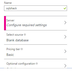 Figure 2. The SQL databases Add a name for the SQL Database and click on the Pricing tier option.
